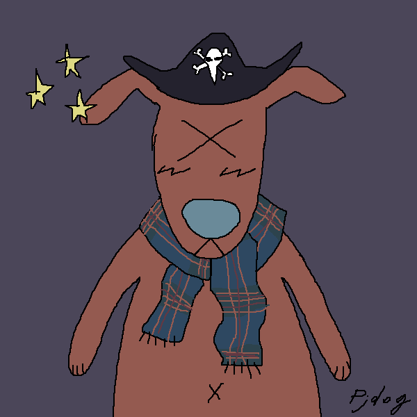 Dessin dans un style très simple, enfantin. C'est un portait d'un chien brun avec les yeux en X, un chapeau de pirate et une écharpe bleue style tartan. Il y a trois étoiles jaune à gauche de sa tête.